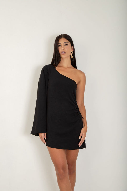 Vestido Um Ombro Só Manga Longa Recorte Preto