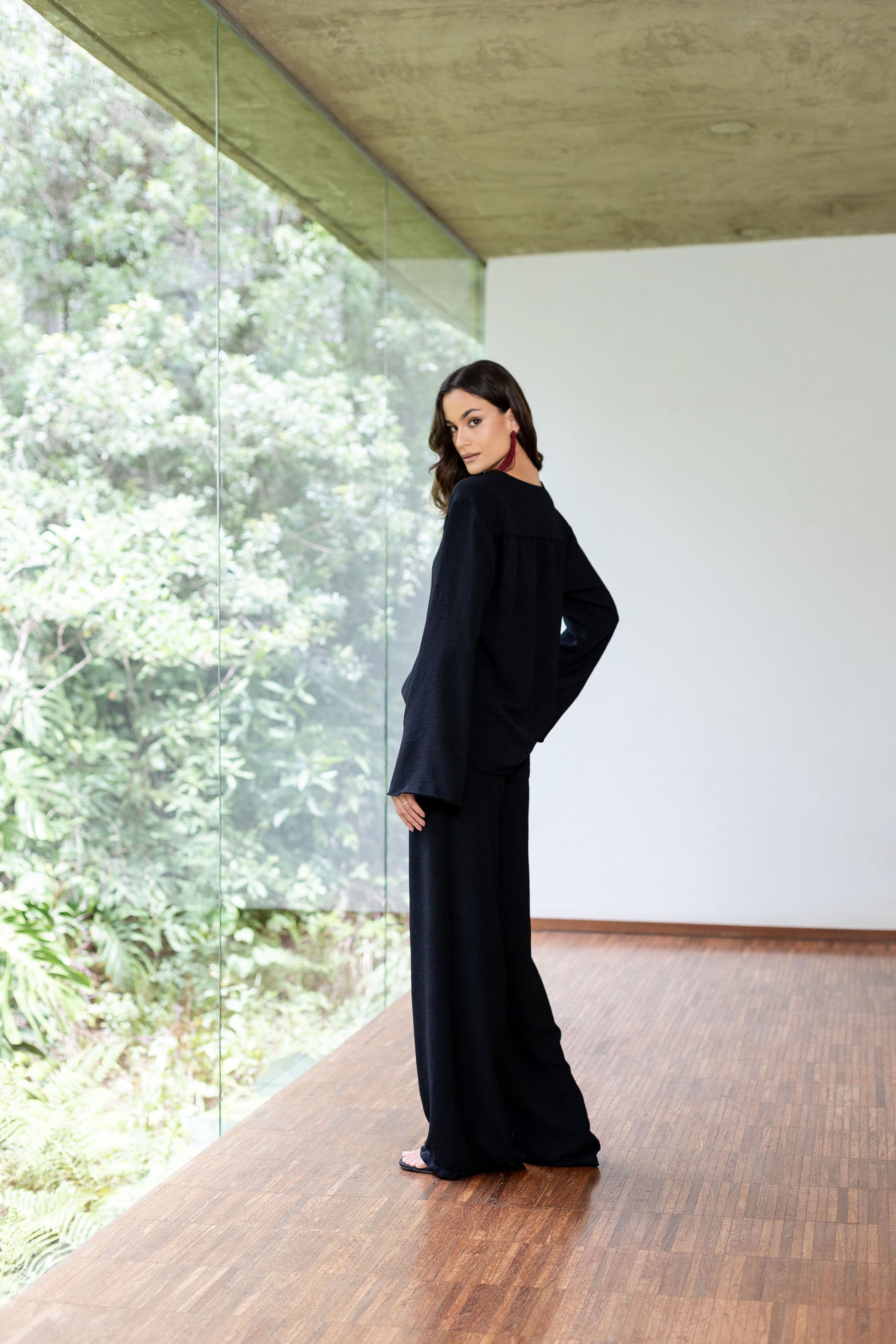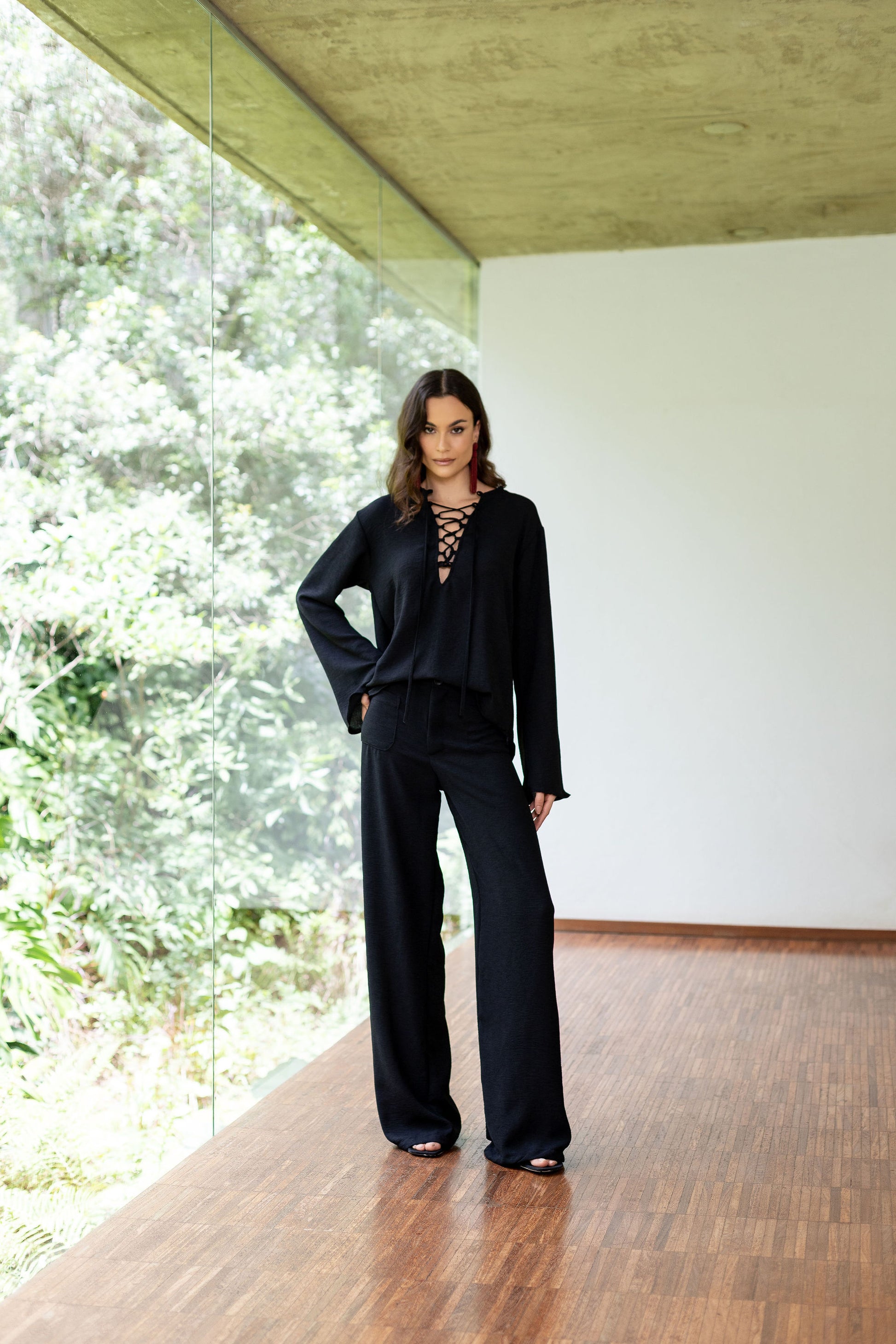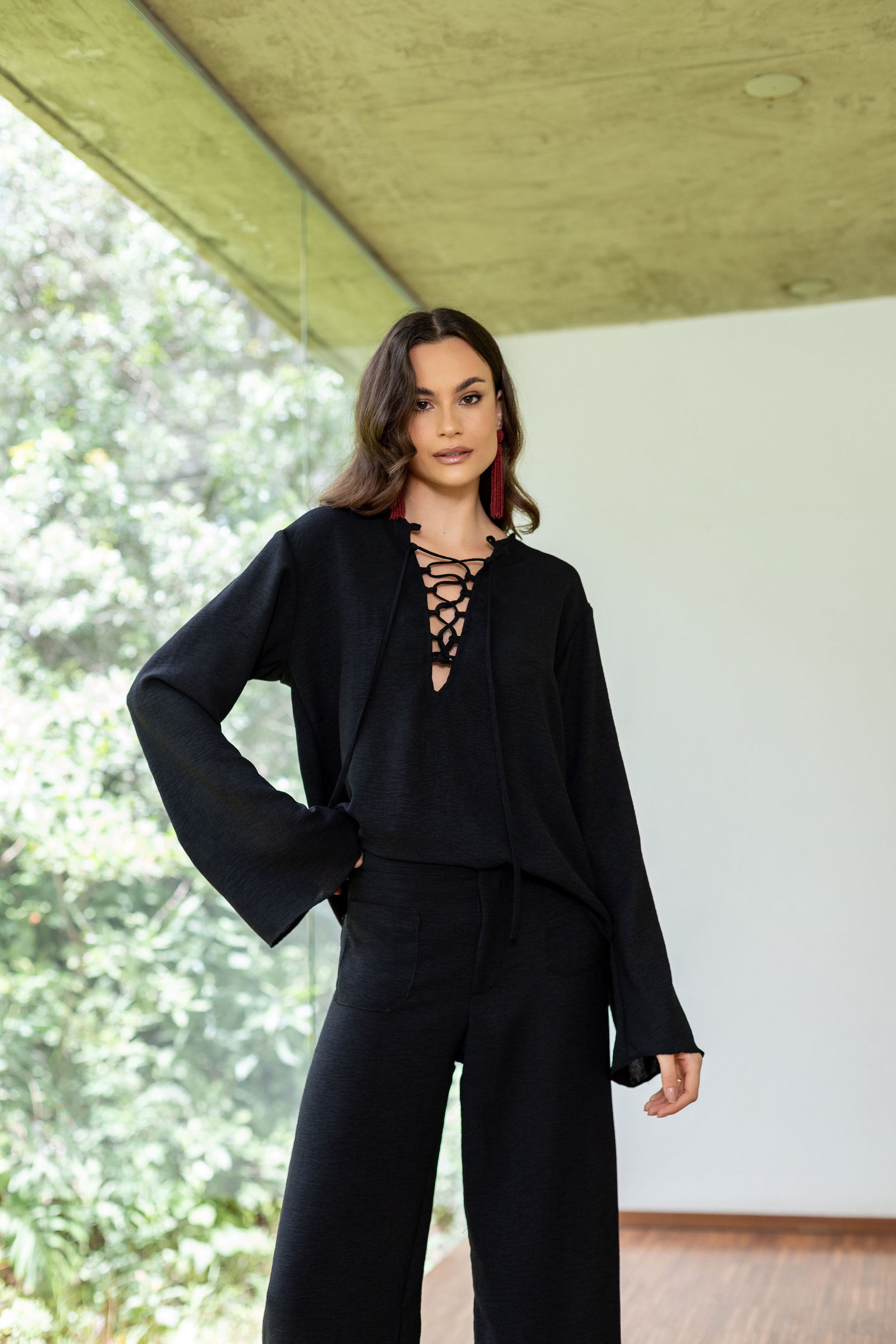Bata em crepe leve com textura rústica, de modelagem ampla e mangas flare. Decote em V profundo com amarração de tiras. Comprimento regular.