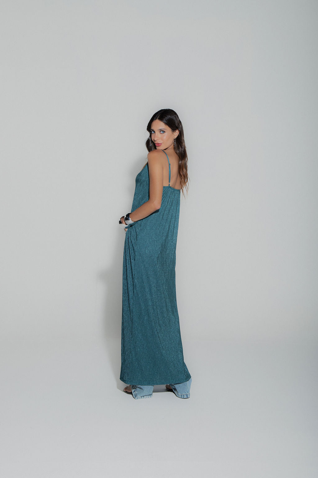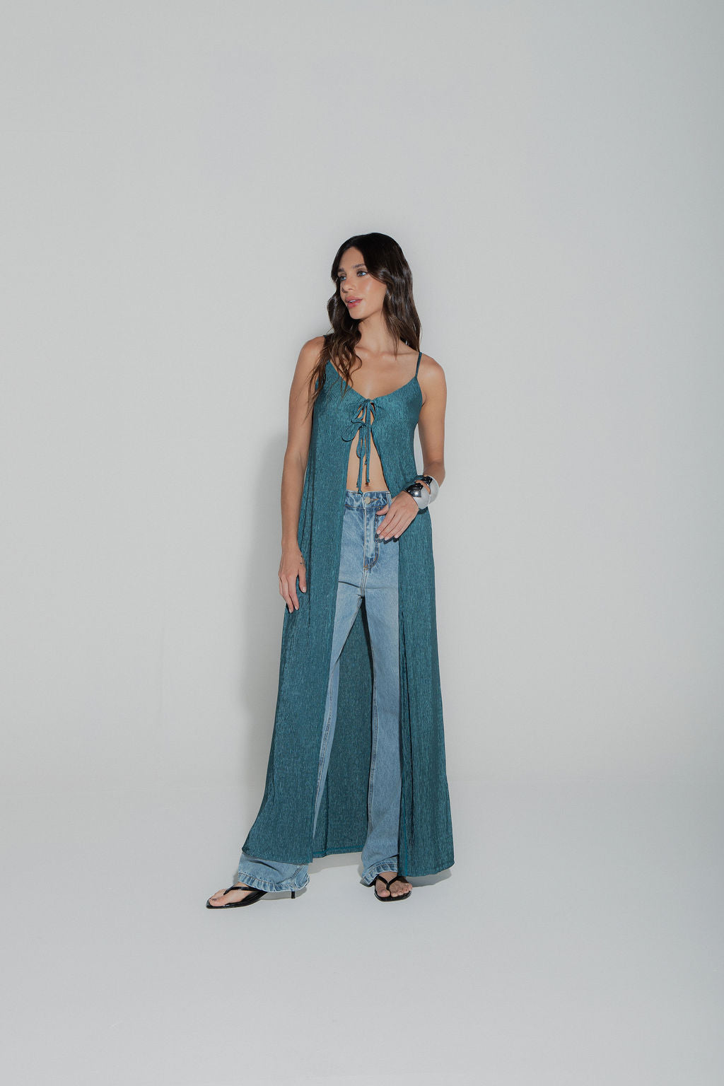Descrição: Túnica longa em malha plissada com toque acetinado. Decote V frontal com alças finas reguláveis. Amarração dupla no busto por rolotês.