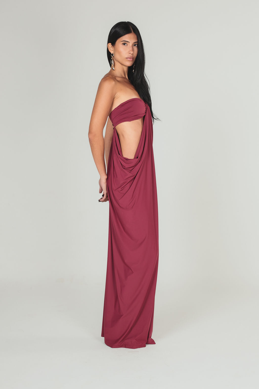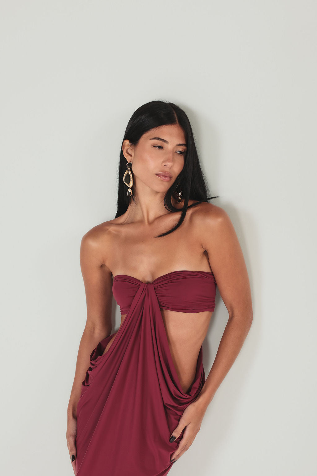 Descrição: Vestido longo em malha fria com corpinho estilo top decote coração. Possui o fechamento por botões nas costas. Saia com drapeados que saem do meio do decote frente e forma um recorte profundo nas laterais.