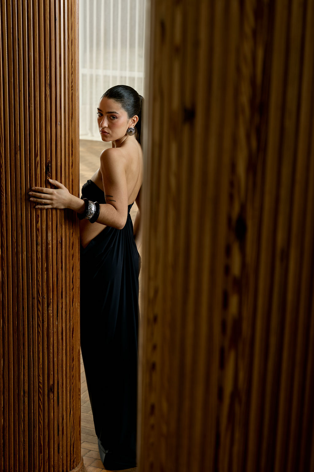 Descrição: Vestido longo em malha fria com corpinho estilo top decote coração. Possui o fechamento por botões nas costas. Saia com drapeados que saem do meio do decote frente e forma um recorte profundo nas laterais.