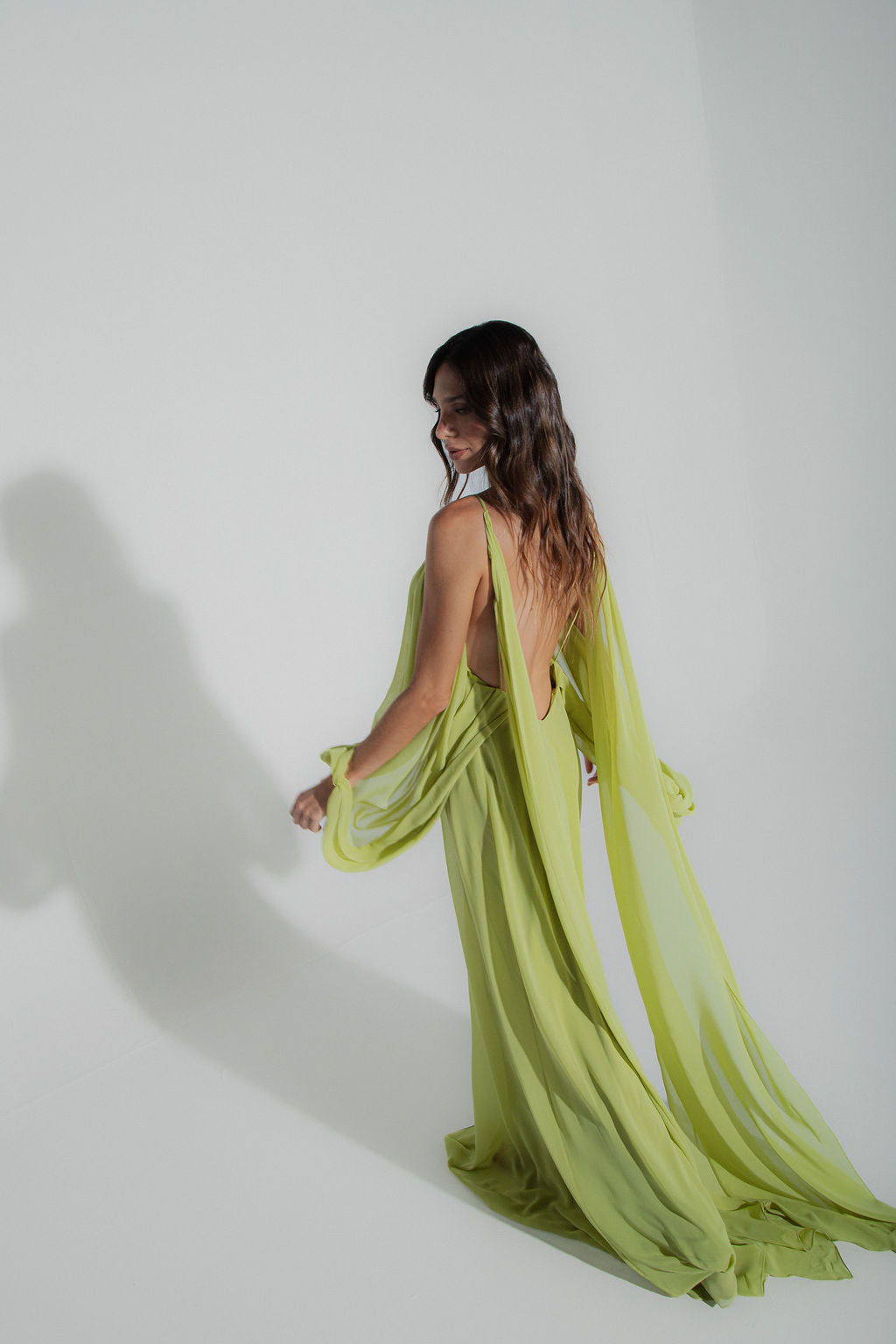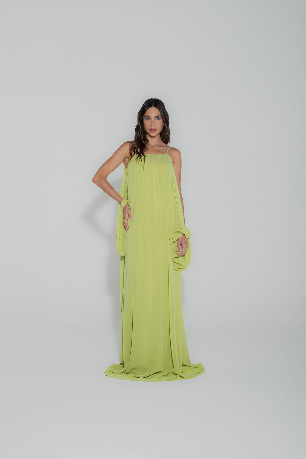 Descrição: Vestido longo em musseline toque de seda com decote frente única e alças finas. Manga ampla aberta com punho ajustado. Decote profundo nas costas e faixa esvoaçante que sai das alças. Vestido sem recorte na cintura, com modelagem em A. Peça feita em tecido leve e fluido e é toda forrada em crepe leve.