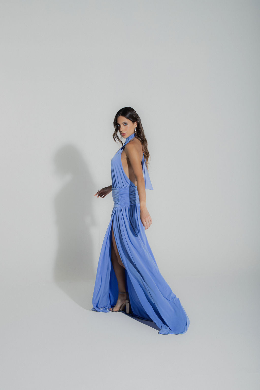 Vestido em malha fosca com alta elasticidade. Modelagem frente única com amarração no pescoço. Pala ajustada com drapeado no quadril e saia fluida com fenda frontal.