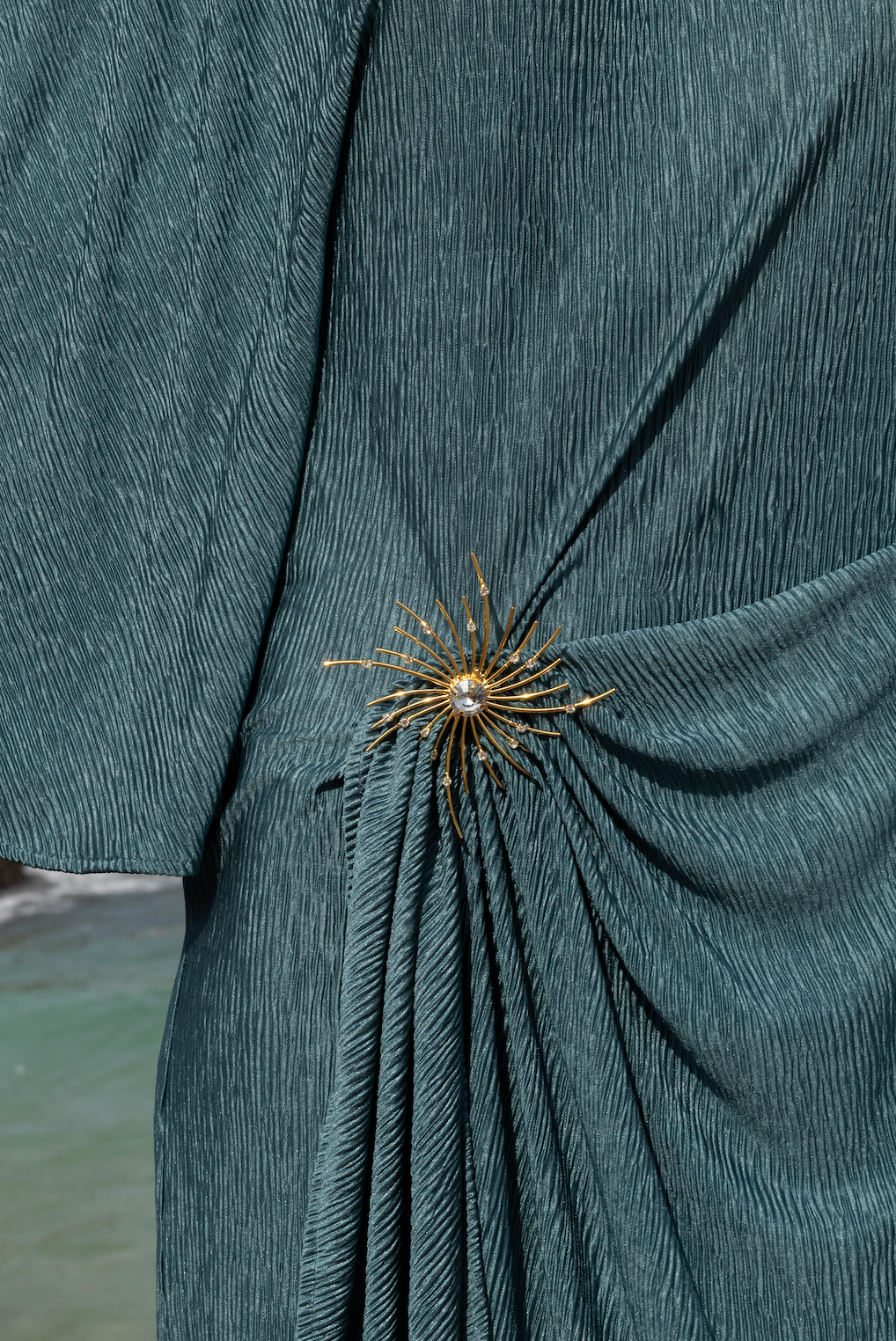 Descrição: Vestido longo de um ombro só, com manga morcego ampla. Saia com sobreposição e faixa transpassada, finalizada por aviamento metálico com cristais. Fenda lateral.