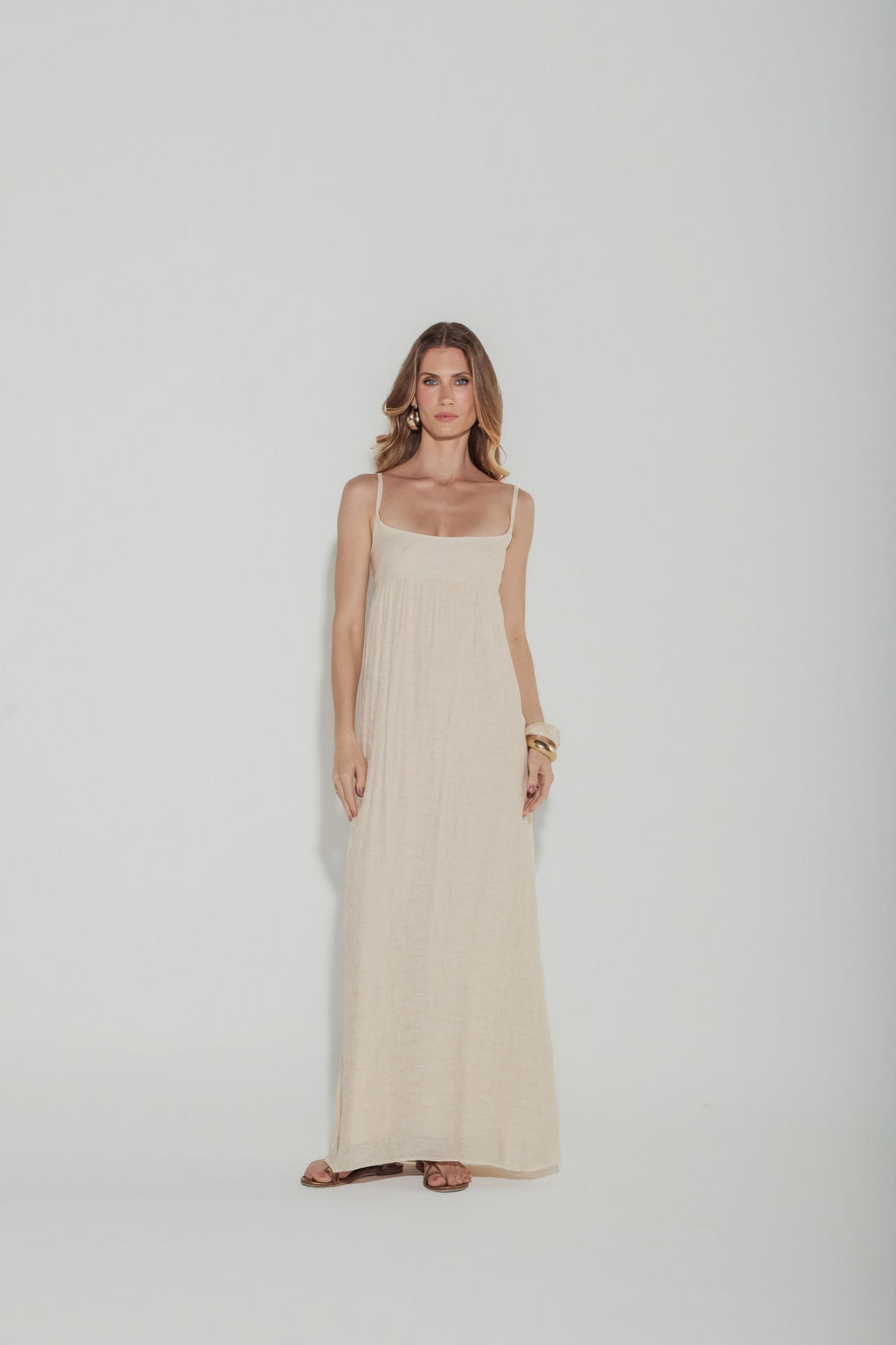 Descrição: Vestido midi confeccionado em tecido jacquard leve, com decote reto, alças finas laterais e modelagem império. Peça forrada até a barra. Alças finas com regulador e lastex nas costas para melhor ajuste.