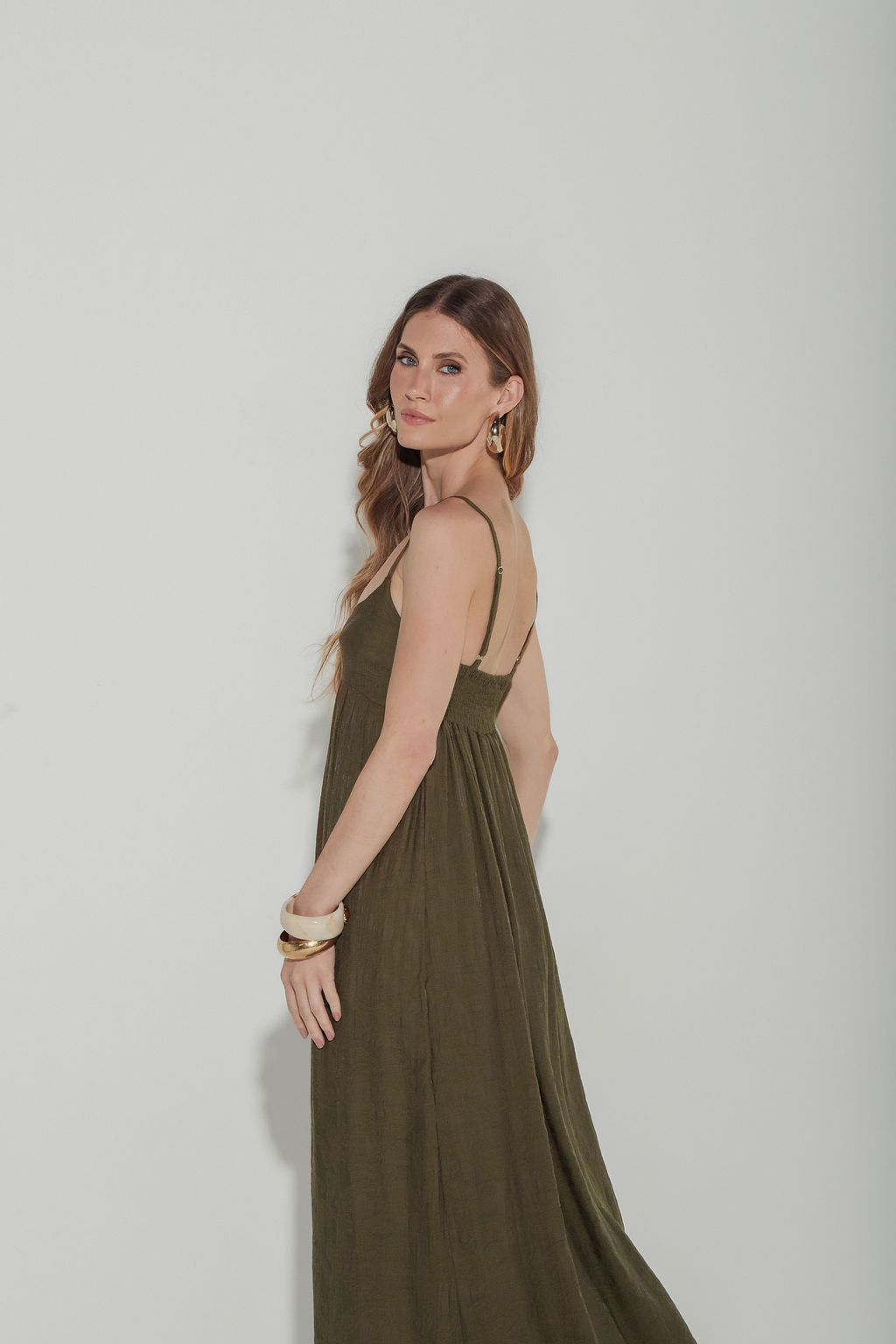 Descrição: Vestido midi confeccionado em tecido jacquard leve, com decote reto, alças finas laterais e modelagem império. Peça forrada até a barra. Alças finas com regulador e lastex nas costas para melhor ajuste.